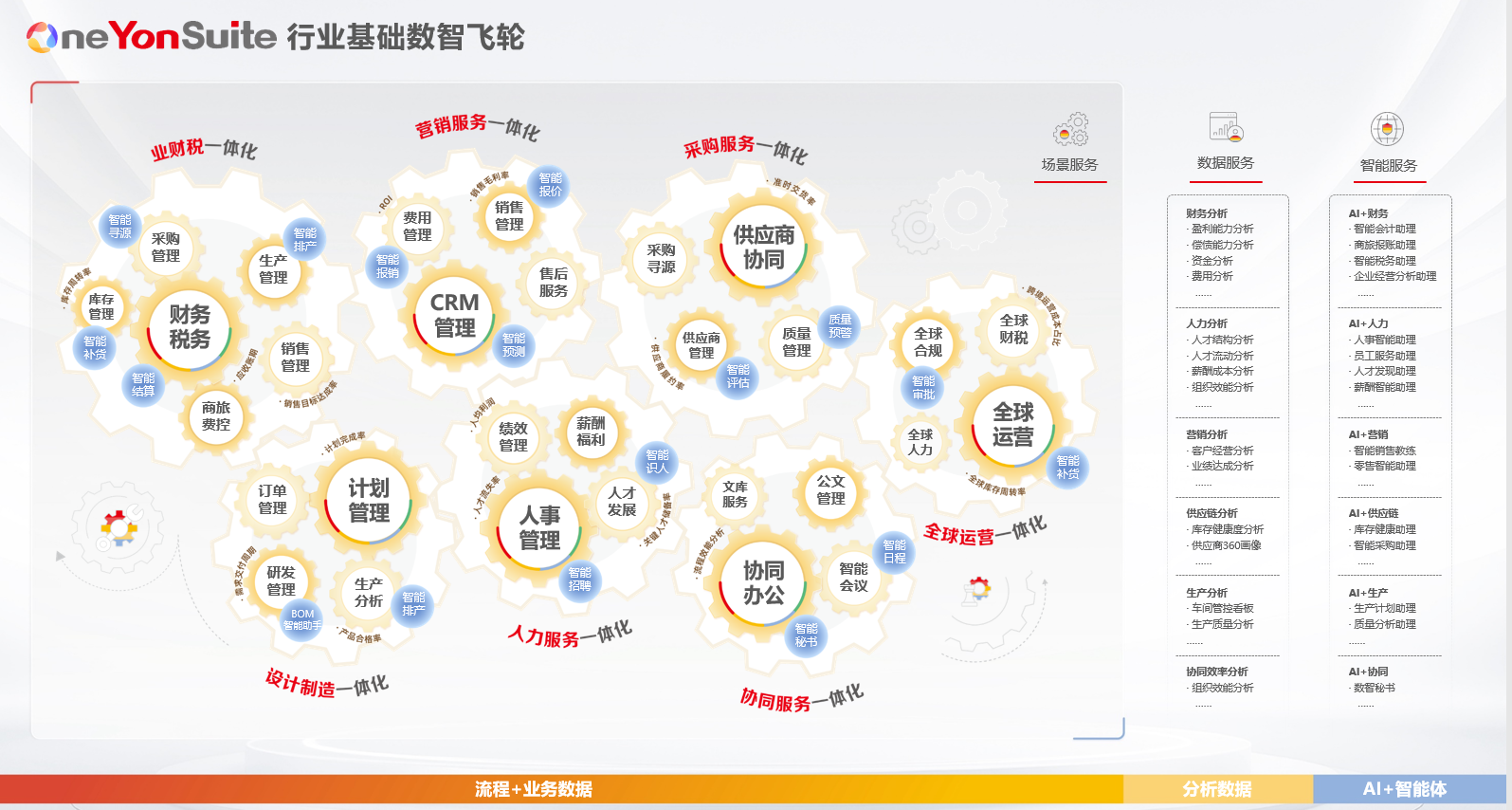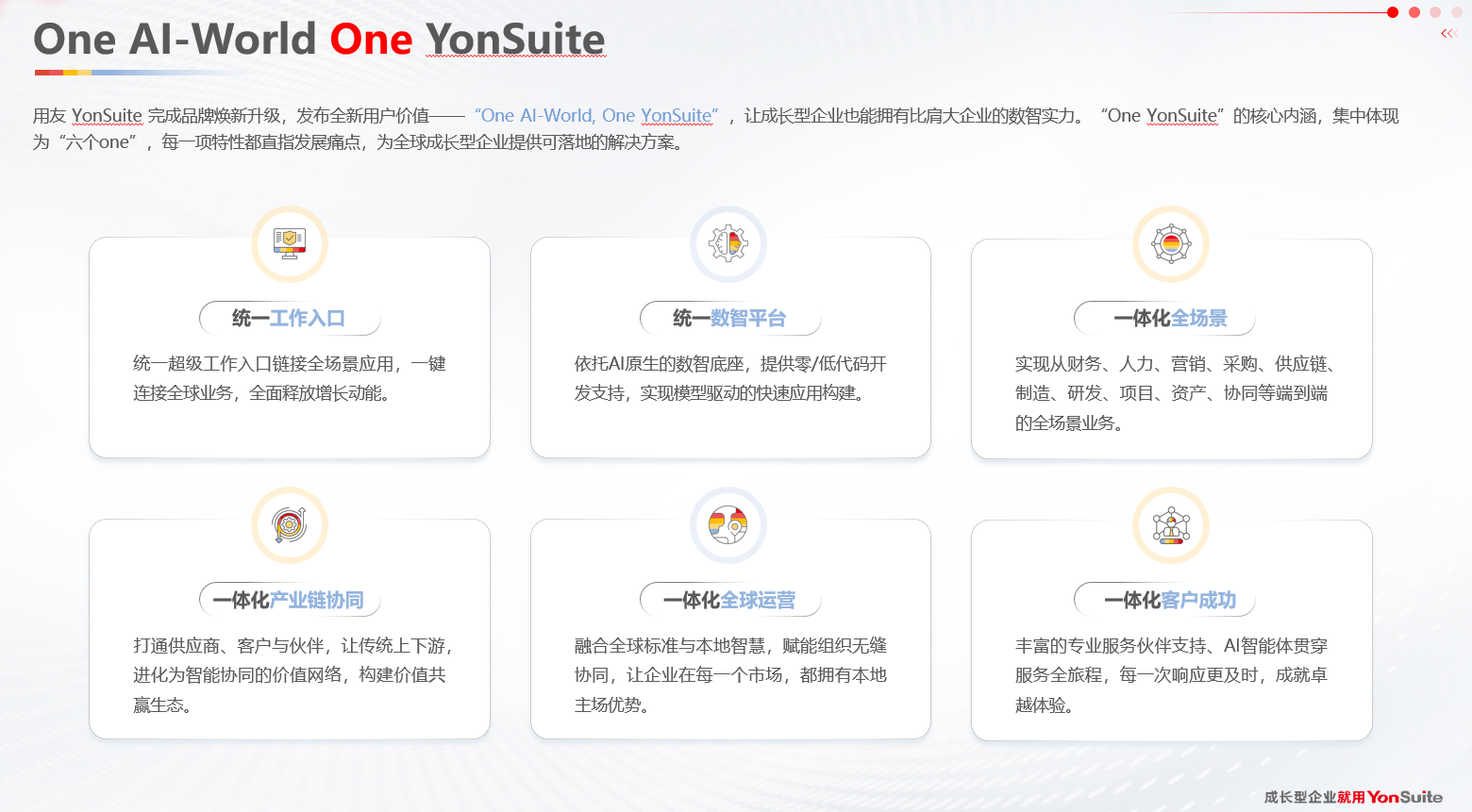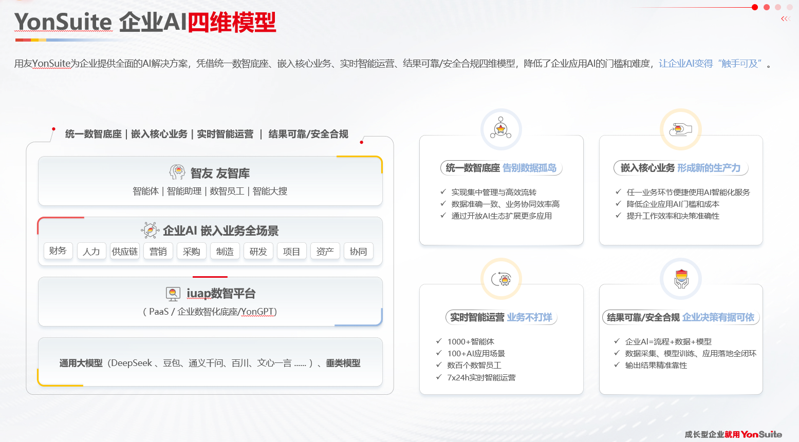 用友YonSuite(全球领先的成长型企业商业创新平台)按照“技术驱动商业创新”的理念,基于 AI、大数据、云计算等新一代数字与智能技术,采用云原生、元数据驱动、数用分离等架构设计,提供能力、工具与资源服务于一体的平台服务(PaaS)、应用服务(SaaS)、业务服务(BaaS)、数据服务(DaaS)与智能服务(AIaaS),涵盖企业的财务、人力、供应链、营销、采购、制造、研发、项目、资产、协同 10 个业务领域,使能企业及产业商业创新(产品与服务创新、组织与管理变革、工作方式转变)的数智服务群,是全球领先的企业软件与智能服务平台,也是数智商业的应用级基础设施和企业服务产业的共创平台。 通过底座平台、应用系统和专业服务,满足当前企业数智化建设的核心诉求,为企业带来“业务敏捷、精益管理、全球运营”三个方面的创新发展价值,成就数智企业。